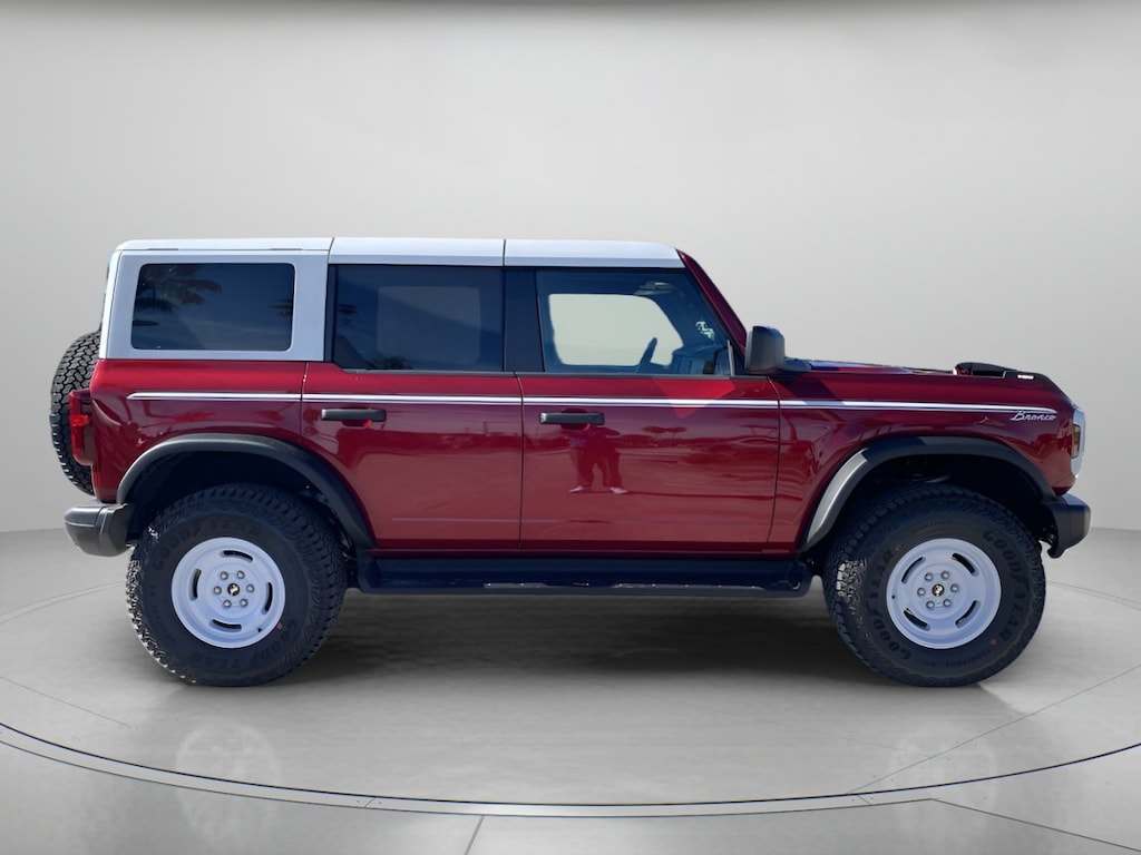 A master of modern capability, our 2025 Ford Bronco Heritage Edition 4 Door 4X4 rocks a retro Race Red design owners love! Motivated by a TurboCharged 2.7 Liter EcoBoost V6 delivering 330hp to a 10 Speed Automatic transmission. An advanced 4X4 system, electronic locking axles, and an off-road HOSS suspension supply impressive tools for the trail, and this Four Wheel Drive SUV sees nearly 21mpg on the highway. Old-school details like a white-painted roof, a white-letter grille, white alloy wheels, powder-coated tube steps, Heritage graphics, and bolt-on fender flares bring out the bold side of our Bronco.