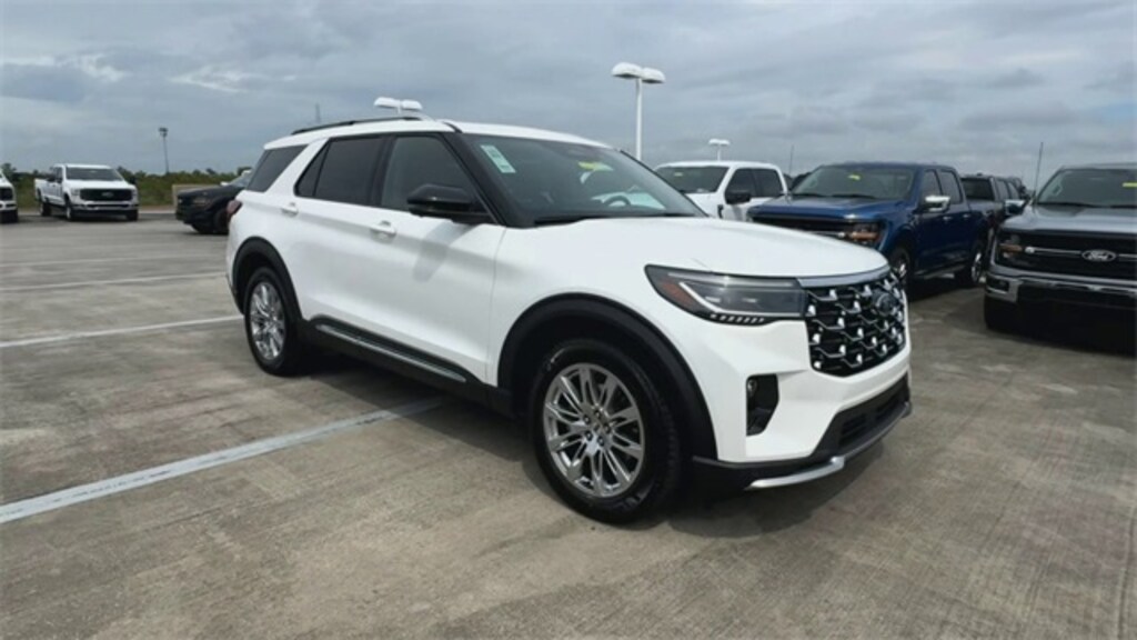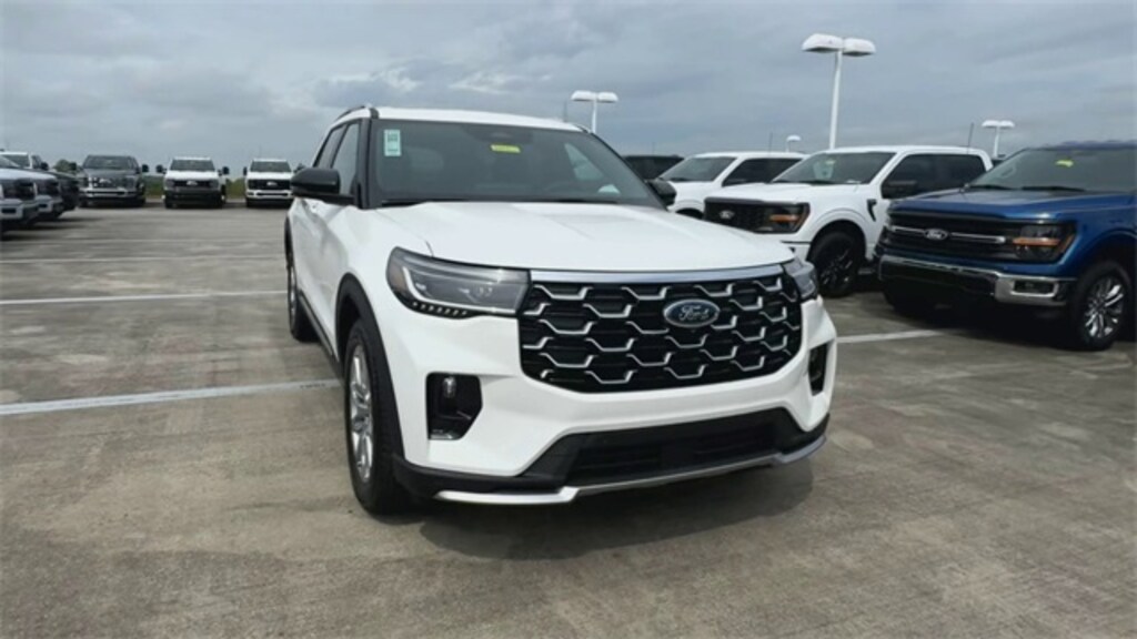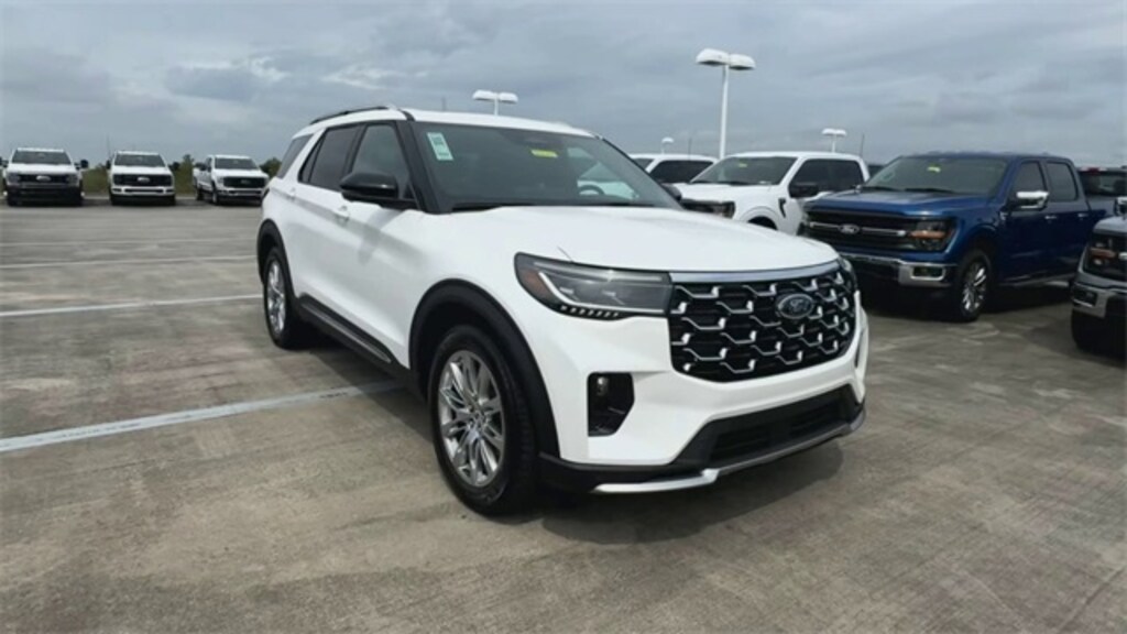 Star White Metallic Tri-Coat 2025 Ford Explorer Platinum On-Order RWD 10-Speed Automatic 2.3L EcoBoost I-4 14 Speakers, 3.58 Non-Limited Slip Rear Axle, 3rd row seats: bench, 4-Wheel Disc Brakes, ABS brakes, ActiveX Trimmed Sport Captain's Chairs, Air Conditioning, Alloy wheels, AM/FM radio: SiriusXM, Apple CarPlay/Android Auto, Auto High-beam Headlights, Auto-dimming door mirrors, Auto-dimming Rear-View mirror, Automatic temperature control, Brake assist, Bumpers: body-color, Compass, Delay-off headlights, Driver door bin, Driver vanity mirror, Dual front impact airbags, Dual front side impact airbags, Electronic Stability Control, Emergency communication system: 911 Assist, Equipment Group 600A Standard Package, Exterior Parking Camera Rear, Ford BlueCruise Equipped (1-Year Plan) (DISC), Four wheel independent suspension, Front anti-roll bar, Front Bucket Seats, Front Center Armrest, Front dual zone A/C, Front fog lights, Front reading lights, Fully automatic headlights, Garage door transmitter, Heated door mirrors, Heated front seats, Heated rear seats, Heated steering wheel, Illuminated entry, Knee airbag, Leather steering wheel, Low tire pressure warning, Memory seat, Navigation System, Occupant sensing airbag, Outside temperature display, Overhead airbag, Overhead console, Panic alarm, Passenger door bin, Passenger vanity mirror, Power door mirrors, Power driver seat, Power Liftgate, Power moonroof, Power passenger seat, Power steering, Power windows, Radio data system, Radio: B&O Sound System by Bang & Olufsen w/HD, Rain sensing wipers, Rear air conditioning, Rear anti-roll bar, Rear reading lights, Rear window defroster, Rear window wiper, Remote keyless entry, Security system, Speed control, Speed-sensing steering, Speed-Sensitive Wipers, Split folding rear seat, Spoiler, Steering wheel mounted audio controls, Tachometer, Telescoping steering wheel, Tilt steering wheel, Traction control, Trip computer, Turn signal indicator mirrors, Variably intermittent wipers, Ventilated front seats, Wheels: 20" Luster Nickel-Painted Aluminum.
