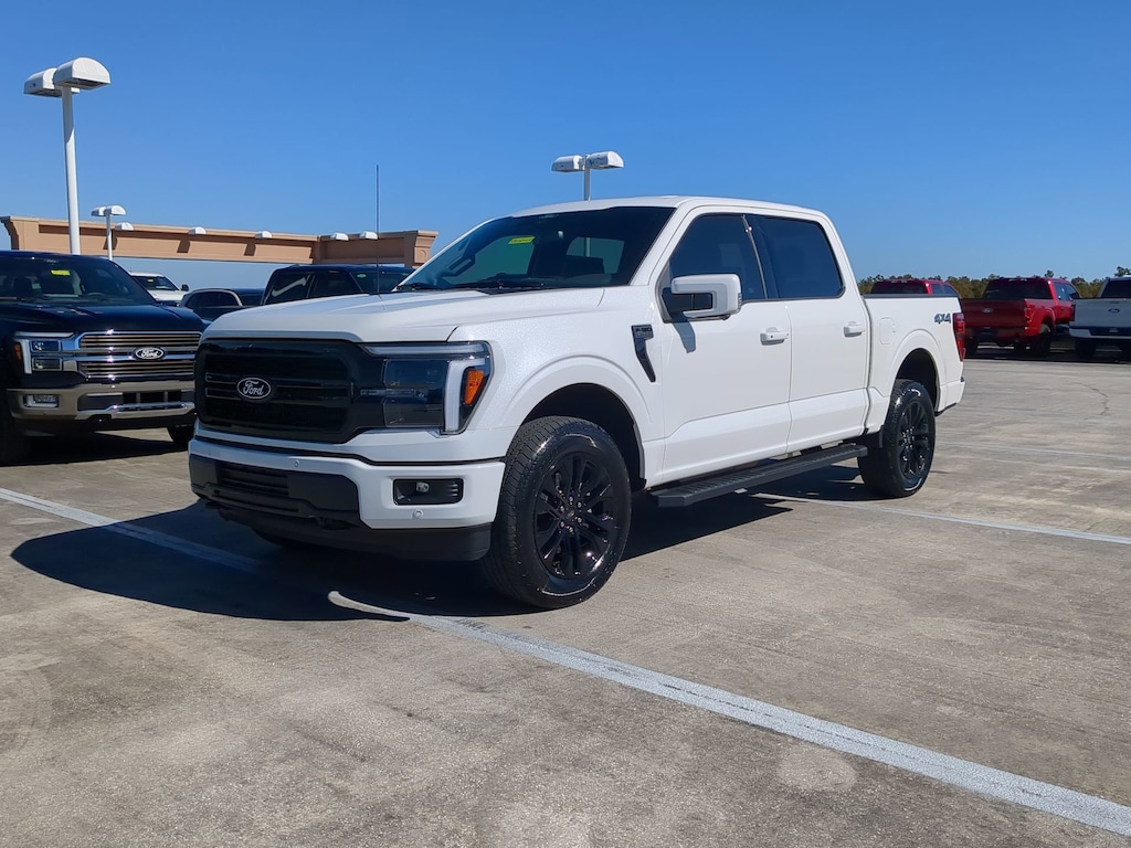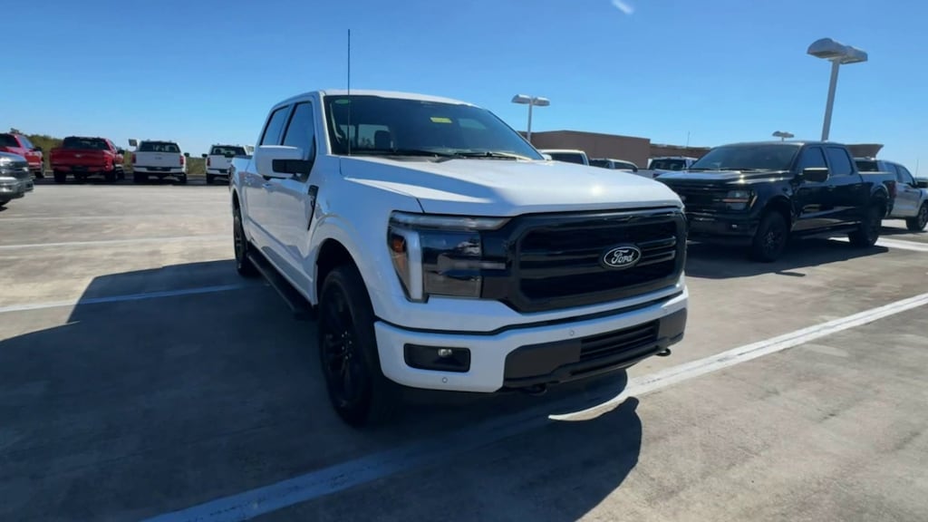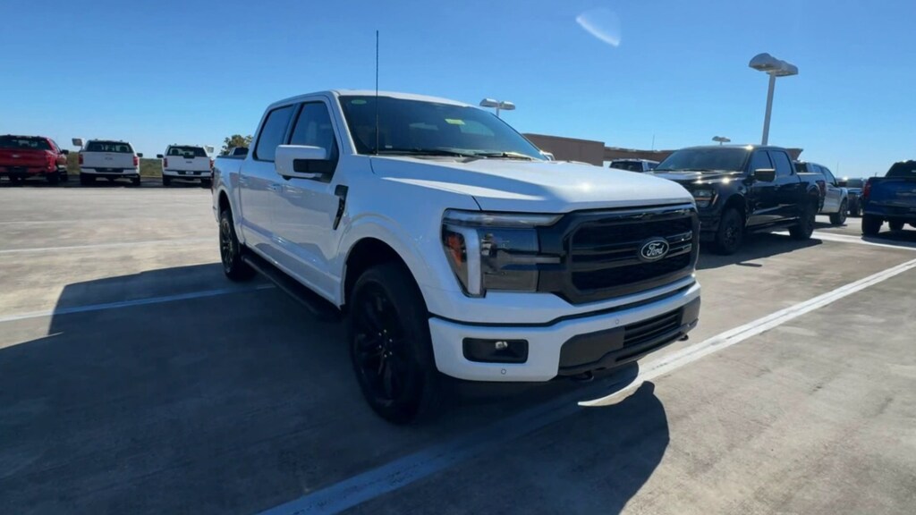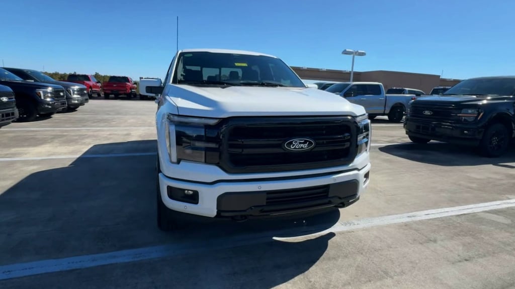 Star White Metallic Tri-Coat 2025 Ford F-150 Lariat In-Stock 4WD 10-Speed Automatic 5.0L V8 4WD, 3.31 Axle Ratio, 4-Wheel Disc Brakes, 6" Angular Bright Anodized Step Bar, 8 Speakers, ABS brakes, ActiveX Trimmed Bucket Seats, Adjustable pedals, Air Conditioning, Alloy wheels, AM/FM radio: SiriusXM with 360L, Auto High-beam Headlights, Auto-dimming door mirrors, Auto-dimming Rear-View mirror, Automatic temperature control, Brake assist, Bumpers: chrome, Chrome wheels, Compass, Console Worksurface, Delay-off headlights, Driver door bin, Driver vanity mirror, Dual front impact airbags, Dual front side impact airbags, Electronic Stability Control, Emergency communication system: SYNC 4 911 Assist, Equipment Group 501A Mid, Front anti-roll bar, Front Bucket Seats, Front Center Armrest, Front dual zone A/C, Front fog lights, Front reading lights, Front wheel independent suspension, Fully automatic headlights, Garage door transmitter, Heated door mirrors, Heated front seats, Heated steering wheel, Illuminated Driver & Passenger Visors, Illuminated entry, Low tire pressure warning, Memory seat, Mobile Office Package, Navigation system: Connected Navigation, Occupant sensing airbag, Outside temperature display, Overhead airbag, Overhead console, Panic alarm, Partitioned Lockable Rear Storage, Passenger door bin, Passenger vanity mirror, Pedal memory, Power door mirrors, Power driver seat, Power passenger seat, Power steering, Power windows, Power-Sliding Rear Window, Radio data system, Radio: B&O Sound System by Bang & Olufsen, Rain sensing wipers, Rear reading lights, Rear seat center armrest, Rear step bumper, Rear window defroster, Remote keyless entry, Security system, Speed control, Split folding rear seat, Steering wheel mounted audio controls, SYNC 4 w/Enhanced Voice Recognition, Tachometer, Telescoping steering wheel, Tilt steering wheel, Traction control, Trip computer, Turn signal indicator mirrors, Variably intermittent wipers, Ventilated front seats, Voltmeter, Wheels: 18" Chrome-Like PVD, Wheels: 20" Chrome-Like PVD, Wireless Charging, 4WD.