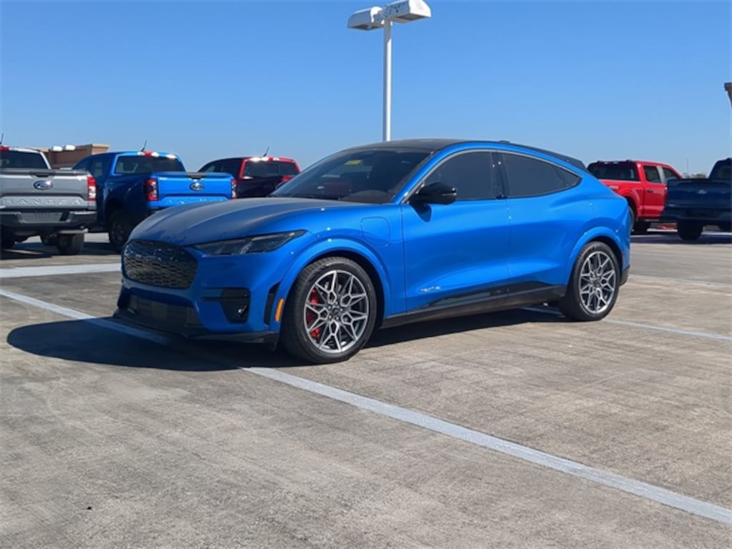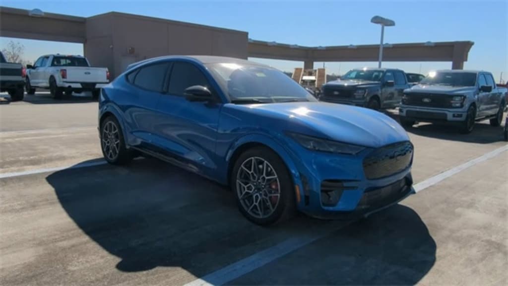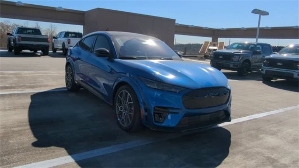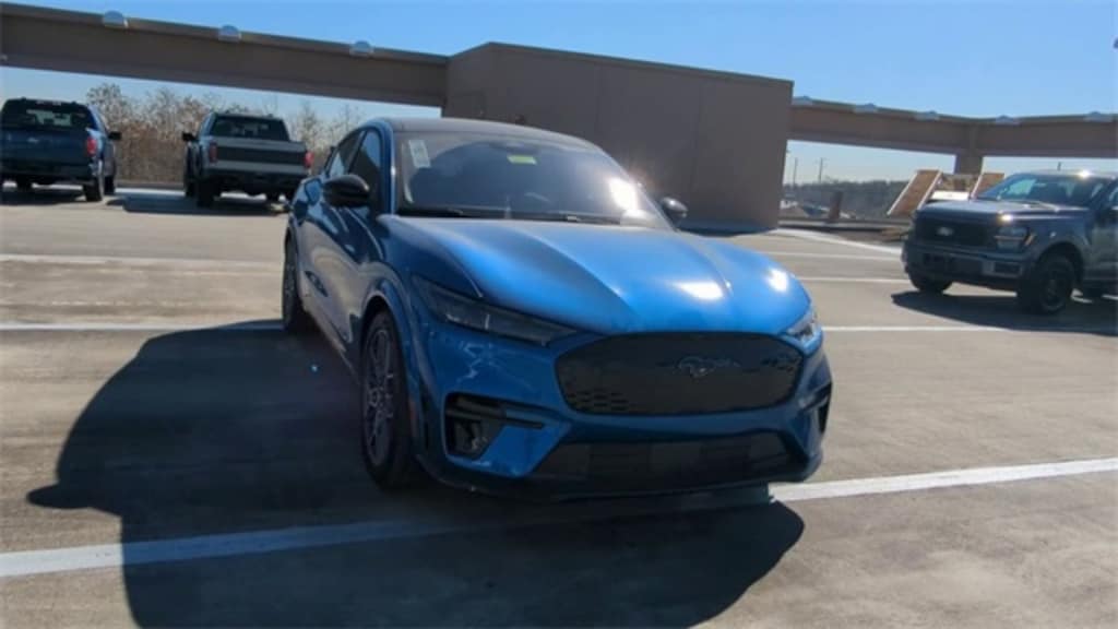 Velocity Blue Metallic 2025 Ford Mustang Mach-E GT In-Transit AWD Single-Speed Automatic Electric Motor 10 Speakers, 4-Wheel Disc Brakes, ABS brakes, Adaptive suspension, Air Conditioning, Alloy wheels, AM/FM radio: SiriusXM with 360L, Apple CarPlay/Android Auto, Auto High-beam Headlights, Auto-dimming Rear-View mirror, Automatic temperature control, Brake assist, Bumpers: body-color, Compass, Delay-off headlights, Driver door bin, Driver vanity mirror, Dual front impact airbags, Dual front side impact airbags, Electronic Stability Control, Emergency communication system: 911 Assist, Equipment Group 400A Standard Package, Exterior Parking Camera Rear, Four wheel independent suspension, Front anti-roll bar, Front Bucket Seats, Front Center Armrest, Front dual zone A/C, Front reading lights, Fully automatic headlights, Garage door transmitter, Heated door mirrors, Heated front seats, Heated Perforated ActiveX Performance Seats, Heated steering wheel, Hood & Decklid Stripe/Door Graphics Delete, Illuminated entry, Knee airbag, Low tire pressure warning, Memory seat, Mobile Power Cord (120V/240V), Navigation system: Connected Navigation, Occupant sensing airbag, Outside temperature display, Overhead airbag, Overhead console, Panic alarm, Panoramic Fixed-Glass Roof, Passenger door bin, Passenger vanity mirror, Power door mirrors, Power driver seat, Power Liftgate, Power passenger seat, Power steering, Power windows, Radio data system, Radio: B&O Sound System by Bang & Olufsen, Rain sensing wipers, Rear anti-roll bar, Rear seat center armrest, Rear side impact airbag, Rear window defroster, Rear window wiper, Remote keyless entry, Security system, SiriusXM w/360L, Speed control, Speed-sensing steering, Speed-Sensitive Wipers, Split folding rear seat, Spoiler, Steering wheel mounted audio controls, SYNC 4A w/Enhanced Voice Recognition, Telescoping steering wheel, Tilt steering wheel, Traction control, Trip computer, Turn signal indicator mirrors, Variably intermittent wipers, Wheels: 20" Machined Face Aluminum, Wheels: 20" Monochromatic High Gloss Black-Painted.