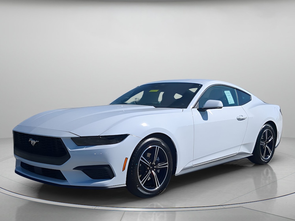 Oxford White 2025 Ford Mustang EcoBoost In-Transit RWD 10-Speed Automatic EcoBoost 2.3L I4 GTDi DOHC Turbocharged VCT 4-Wheel Disc Brakes, ABS brakes, Active Valve Performance Exhaust, Air Conditioning, Alloy wheels, AM/FM Stereo, Auto High-beam Headlights, Automatic temperature control, Brake assist, Bumpers: body-color, Compass, Delay-off headlights, Driver door bin, Driver vanity mirror, Dual front impact airbags, Dual front side impact airbags, Electronic Stability Control, Emergency communication system: 911 Assist, Exterior Parking Camera Rear, Four wheel independent suspension, Front anti-roll bar, Front Bucket Seats, Front Center Armrest, Front dual zone A/C, Front reading lights, Fully automatic headlights, Illuminated entry, Knee airbag, Leather Shift Knob, Low tire pressure warning, Occupant sensing airbag, Outside temperature display, Overhead airbag, Overhead console, Panic alarm, Passenger door bin, Passenger vanity mirror, Power door mirrors, Power steering, Power windows, Radio data system, Rain sensing wipers, Rear anti-roll bar, Rear Parking Sensors, Rear window defroster, Remote keyless entry, Speed control, Speed-sensing steering, Speed-Sensitive Wipers, Split folding rear seat, Sport steering wheel, Steering wheel mounted audio controls, SYNC 4, Tachometer, Telescoping steering wheel, Tilt steering wheel, Traction control, Trip computer, Variably intermittent wipers, Voltmeter, Wheels: 18" x 8" Machined-Face Aluminum.