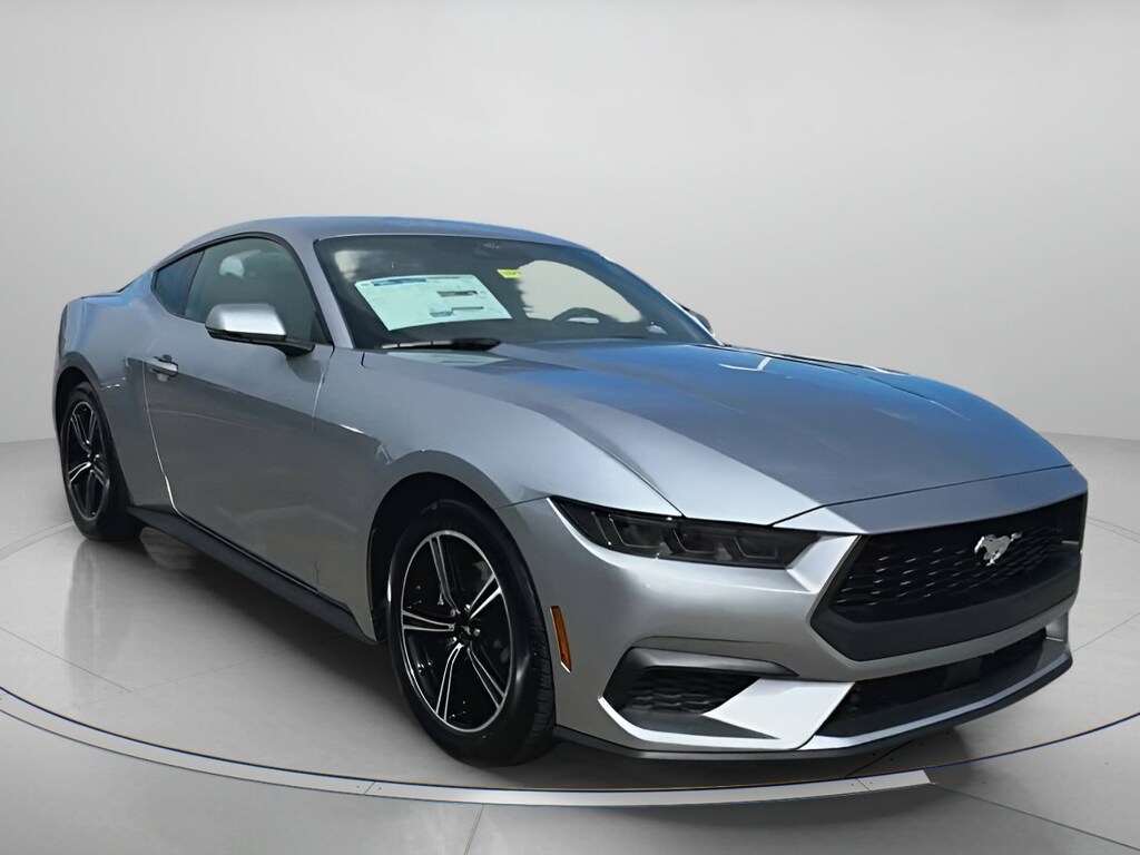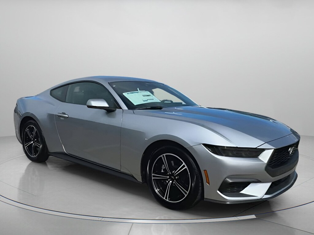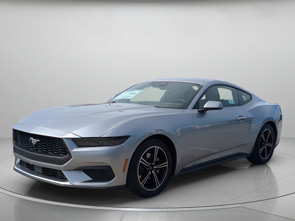 Iconic Silver Metallic 2025 Ford Mustang EcoBoost Premium In-Transit RWD 10-Speed Automatic EcoBoost 2.3L I4 GTDi DOHC Turbocharged VCT 4-Wheel Disc Brakes, ABS brakes, Air Conditioning, Alloy wheels, AM/FM Stereo, Auto High-beam Headlights, Automatic temperature control, Brake assist, Bumpers: body-color, Compass, Delay-off headlights, Driver door bin, Driver vanity mirror, Dual front impact airbags, Dual front side impact airbags, Electronic Stability Control, Emergency communication system: 911 Assist, Exterior Parking Camera Rear, Four wheel independent suspension, Front anti-roll bar, Front Bucket Seats, Front Center Armrest, Front dual zone A/C, Front reading lights, Fully automatic headlights, Illuminated entry, Knee airbag, Leather Shift Knob, Low tire pressure warning, Occupant sensing airbag, Outside temperature display, Overhead airbag, Overhead console, Panic alarm, Passenger door bin, Passenger vanity mirror, Power door mirrors, Power steering, Power windows, Radio data system, Rain sensing wipers, Rear anti-roll bar, Rear Parking Sensors, Rear window defroster, Remote keyless entry, Speed control, Speed-sensing steering, Speed-Sensitive Wipers, Split folding rear seat, Sport steering wheel, Steering wheel mounted audio controls, SYNC 4, Tachometer, Telescoping steering wheel, Tilt steering wheel, Traction control, Trip computer, Variably intermittent wipers, Voltmeter, Wheels: 18" x 8" Machined-Face Aluminum.